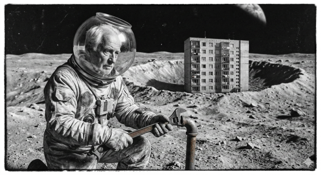 Zarząd Wspólnoty Księżycowej informuje, że w najbliższy wtorek (czasu ziemskiego) odbędą się planowane prace konserwacyjne głównego rurociągu tlenowego w kwartale C-14. Prosimy o nieotwieranie śluz zewnętrznych w godzinach 12:00 – 16:00 oraz o powstrzymanie się od intensywnego oddychania w tym czasie. Dla osób z mniejszą pojemnością płuc przygotowaliśmy zapasowe balony z mieszanką helu i azotu (do odebrania u Dozorcy Robota).