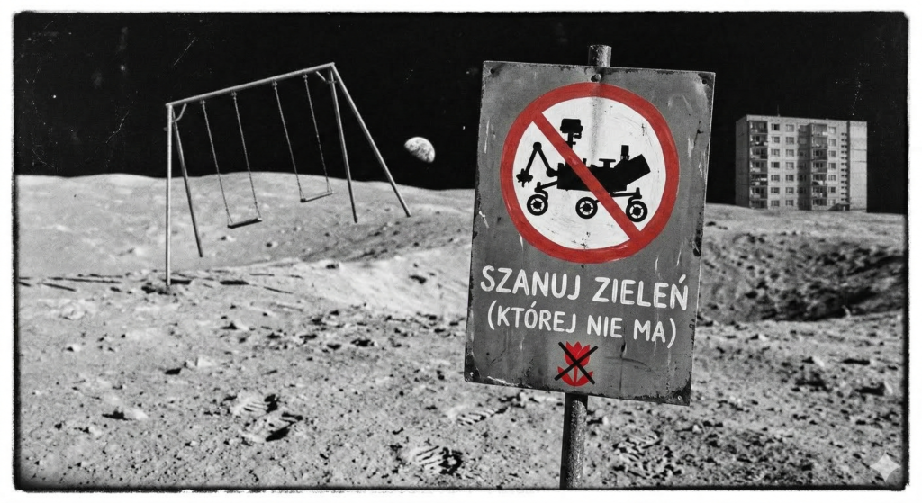 Jednocześnie przypominamy o bezwzględnym zakazie wyprowadzania łazików autonomicznych na nowo zasiane trawniki z pyłu kwarcowego. Gąsienice niszczą strukturę kraterów ozdobnych, a wycieki oleju hydraulicznego psują estetykę naszej małej ojczyzny. Właściciele łazików, którzy nie uprzątną „wycieków” po swoich maszynach, zostaną obciążeni kosztami rekultywacji powierzchni przez wyspecjalizowaną ekipę międzygalaktyczną.